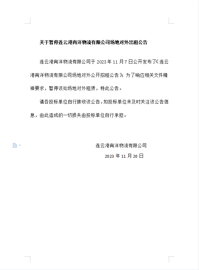 關(guān)于暫停連云港宵洋物流有限公司場(chǎng)地對(duì)外出租公告