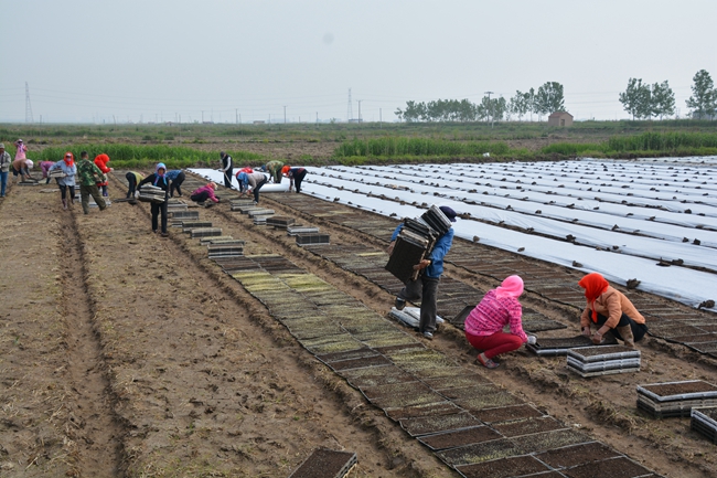 種糧大戶俞正猛正在張羅工人們擺盤育秧。運盤、擺盤、覆膜、壘土,工人們或快速或仔細地高效運轉(zhuǎn)著,三輛三輪車前后停在田埂上,車上整齊的擺放著數(shù)以萬盤的暗化苗,這些暗化苗來自生態(tài)種養(yǎng)中心育秧大棚,硬盤里面一層軟盤放入基質(zhì),撒入稻種,在大棚里通過一定的溫度和濕度的科學(xué)管理,出芽后運送到各個田頭。男工負責(zé)把硬盤在秧板上均勻放好,再由心細的女工把軟盤從硬盤上拿出擺放在秧板地上,一條秧板擺完,立刻蓋上無紡布薄膜,就地挖土壓住防風(fēng),保護好秧苗不被曬傷??盏挠脖P運到田邊由專人整理回收最后運回生態(tài)種養(yǎng)中心。全部擺完以后上好水,一整套工序就算完成。不到一天時間,一萬多盤秧盤已經(jīng)被工人們?nèi)粩[完。