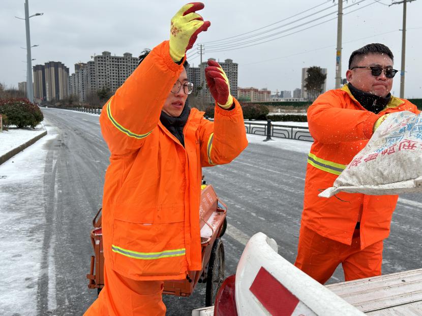 本次掃雪除冰共配備了3輛清掃車、2輛鏟車、1輛撒布機(jī)以及20余噸融雪劑,20余把推雪鏟、鐵鍬等清雪工具,采取“邊下邊除、邊除邊清、邊清邊運(yùn)”的方式,根據(jù)道路積雪厚度和結(jié)冰情況,通過撒布融雪劑、除雪鏟推雪、人工配合等多措并舉,有效清理區(qū)內(nèi)主干道積雪,做到“即下即掃、雪停路清”,保障群眾出行安全。此外,針對(duì)紅綠燈路口、馬路轉(zhuǎn)彎處、陡坡、橋面以及非機(jī)動(dòng)車道等重要節(jié)點(diǎn),環(huán)衛(wèi)分公司又出動(dòng)了100余名工作人員點(diǎn)對(duì)點(diǎn)人工撒布融雪劑,共保障面積300余萬平方米。